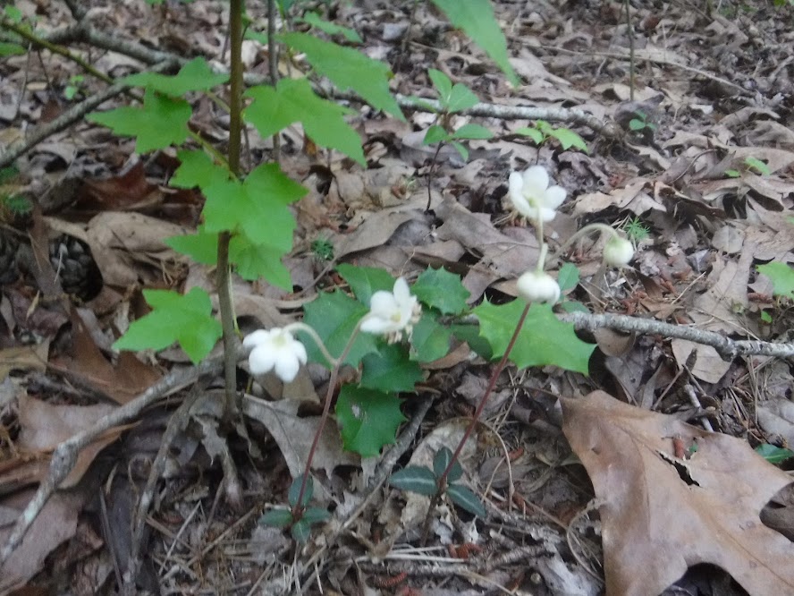 This less than an inch wide wildflower is occasional, and hardly rare here. The 'Spotted Wintergreen' or 'Pipsissewa', in fact, evergreen. Chimaphila maculata. With leaves not truly spotted, as the species name implies, but nicely striped. When I was young, and first saw the waxy little flowers, I noticed they smelled good.