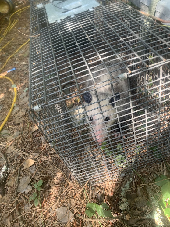 Trying to trap the Groundhog. And that succeeded. But one of the traps still had some several day old pieces of apple. Fortunately, I was able to get this Opossum out of the trap without much fuss.